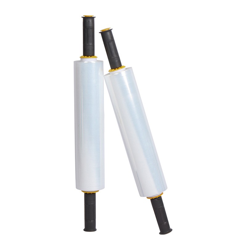 弊社のPEストレッチフィルム手巻用は新型包装材料で伸縮性、高延長性、高透明性、優れた破裂抵抗等の特性を有します。製品にピッタリと密着、固定して運送中の荷垂れの防止ができ、高透明性の為仕上がりが綺麗です。また防水・防塵、荷物が破ける心配もありません。低コストのため、電子材料、化学品、金属製品、自動車部品、電線、ケーブル、紙製品、日用品、食品等産業のパレット包装に適します。
